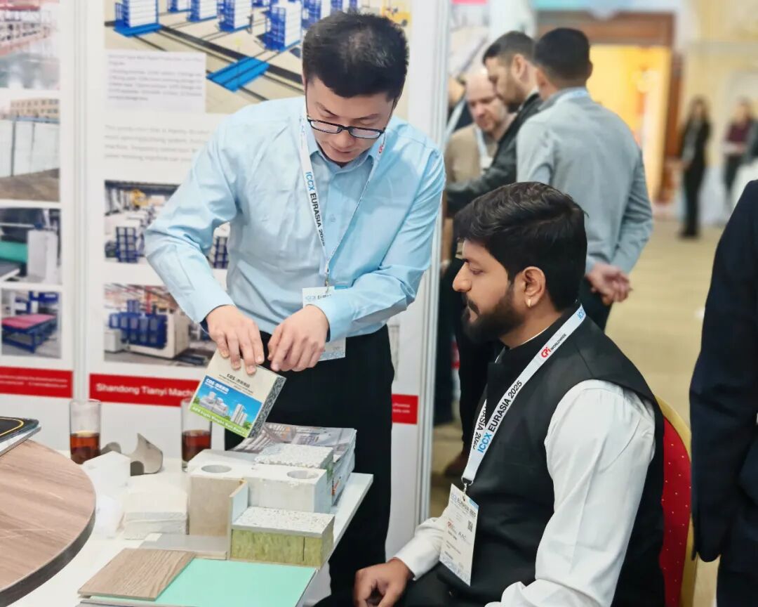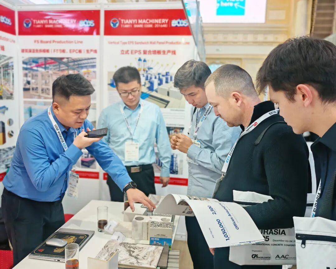 在裝配式建筑裝備方面,天意集團展示了PC生產(chǎn)線、墻板裝備和保溫裝飾一體板生產(chǎn)線。PC生產(chǎn)線自動化流程設(shè)計,減少人工依賴,契合當(dāng)?shù)貏趧恿寄芩讲灰坏默F(xiàn)狀,有助于提升施工穩(wěn)定性;墻板裝備實現(xiàn)工業(yè)廢渣再利用,降低建材成本,符合環(huán)保政策要求;保溫裝飾一體板生產(chǎn)線可生產(chǎn)集多種功能于一體的新型墻體材料,采用模塊化設(shè)計,能根據(jù)客戶需求靈活配置不同飾面工藝,滿足中亞地區(qū)多樣化建筑風(fēng)格需求。