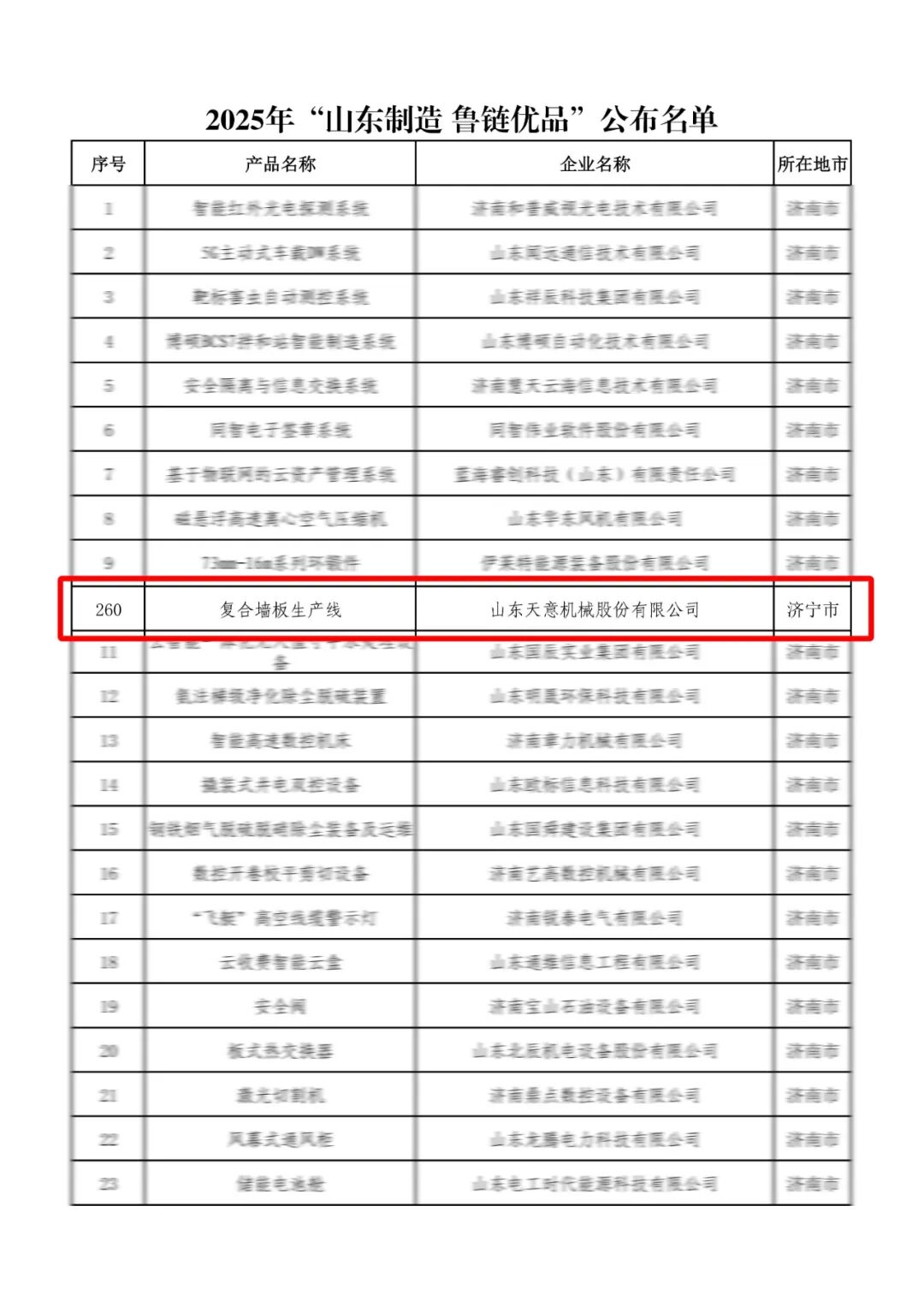 近日,山東省工業(yè)和信息化廳公布“山東制造·魯鏈優(yōu)品”品牌名單,山東天意機械股份有限公司自主研發(fā)的復合墻板生產線成功入選,標志著公司在綠色建材裝備領域的創(chuàng)新實力與產業(yè)鏈引領地位再獲權威認可。 “山東制造·魯鏈優(yōu)品”評選旨在聚焦省內優(yōu)勢產業(yè)鏈,培育一批質量卓越、技術領先、管理精細的標桿產品與企業(yè)。天意機械憑借在裝配式建筑裝備領域的持續(xù)深耕,其復合墻板生產線以高度自動化、節(jié)能環(huán)保、穩(wěn)定高效等特點脫穎而出,成為推動建筑產業(yè)現(xiàn)代化的重要力量。
